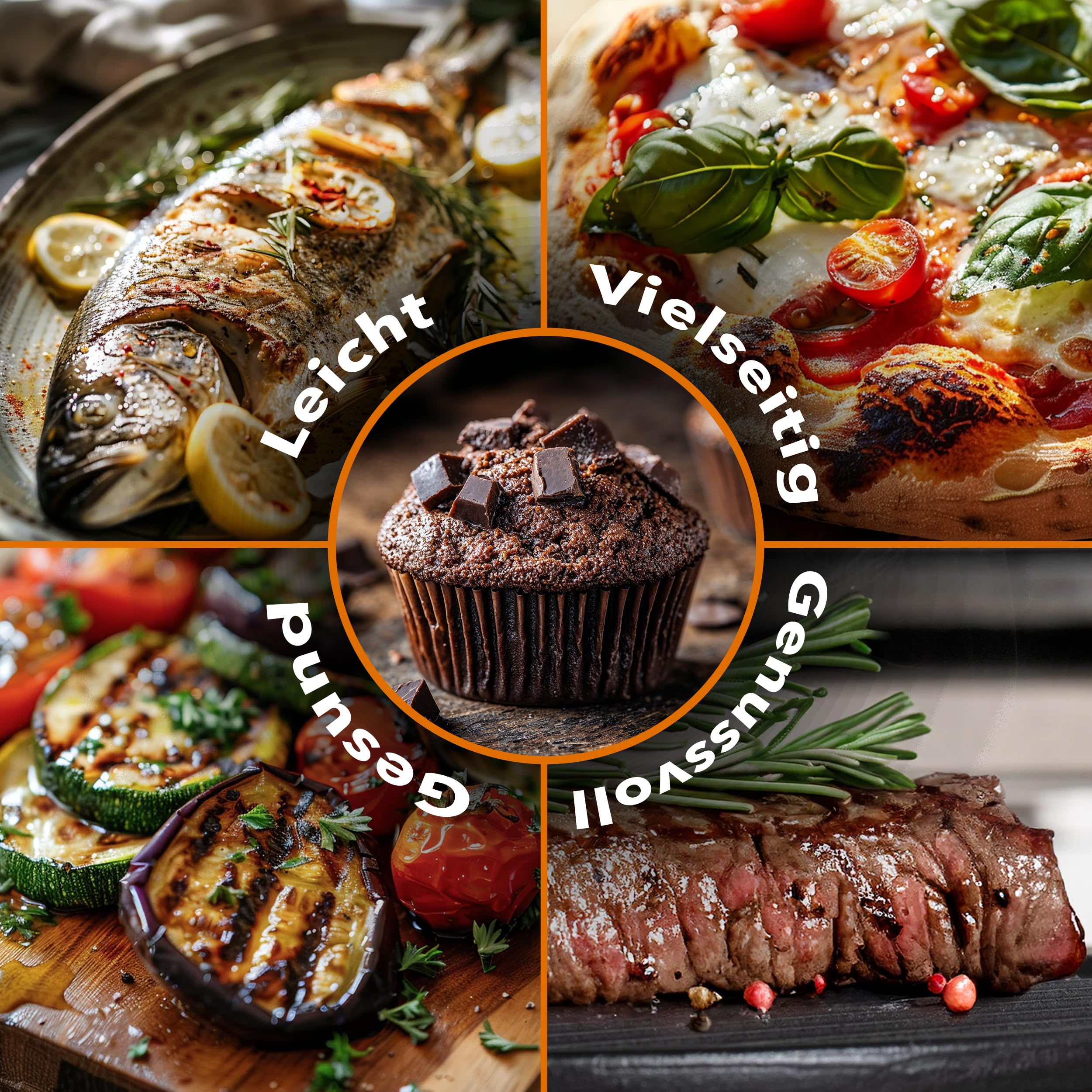 BAUMFELD PizzaAirfryer400 black - 12 in 1 Multifunktionsofen, Pizzaofen, 400 °C, tragbar, Grillen, Pizza, Air Fryer, Backen, XXL Zubehör, Indoor, Steinofenplatte, Gusseisenblech