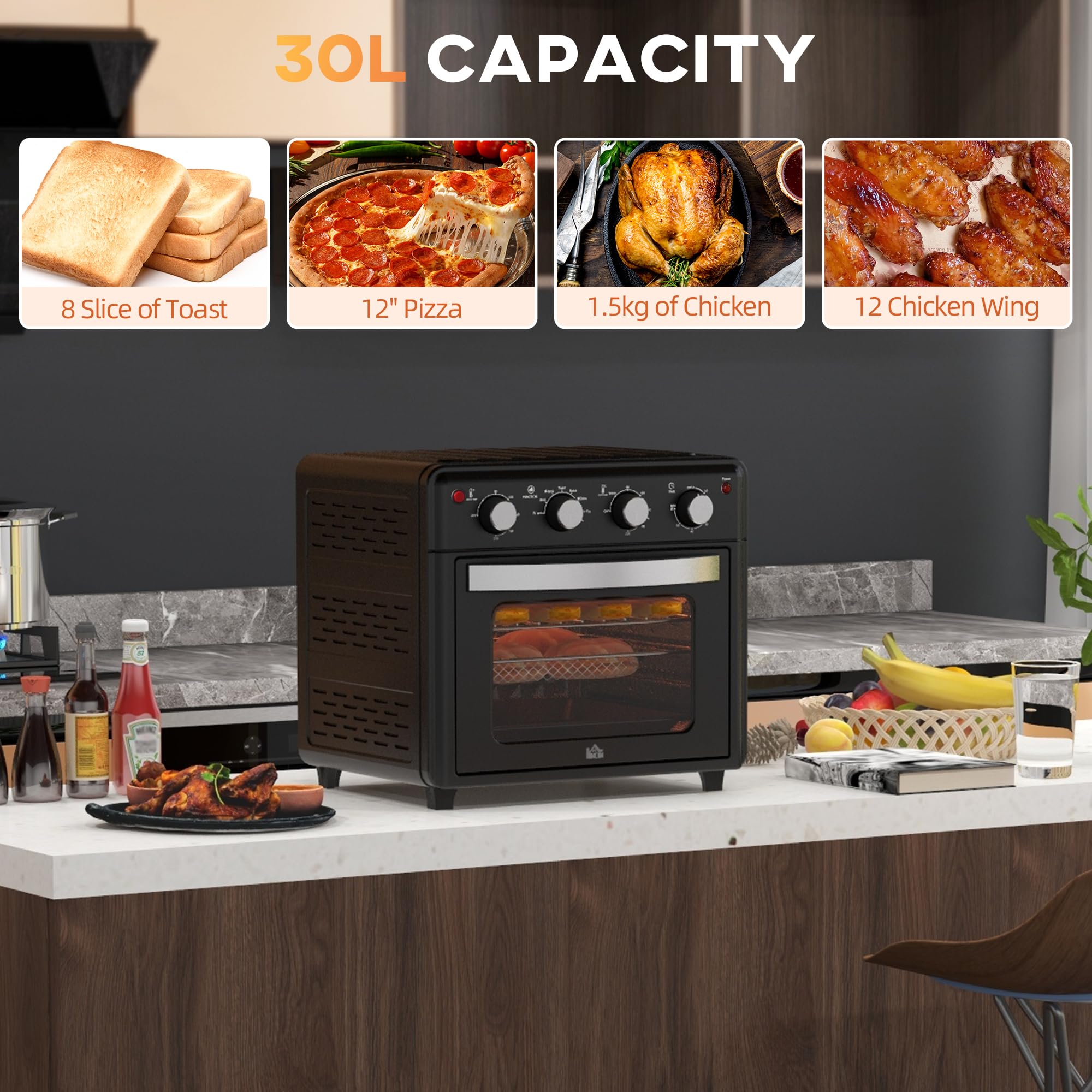 HOMCOM Mini Backofen mit Umluft 30 L 1600W 90-230℃ 60 Min. Timer inkl. Krümelblech, Warmhalteplatten, Backblech, Grillrost, Frittierkorb, Minibackofen Pizza-Ofen, Schwarz