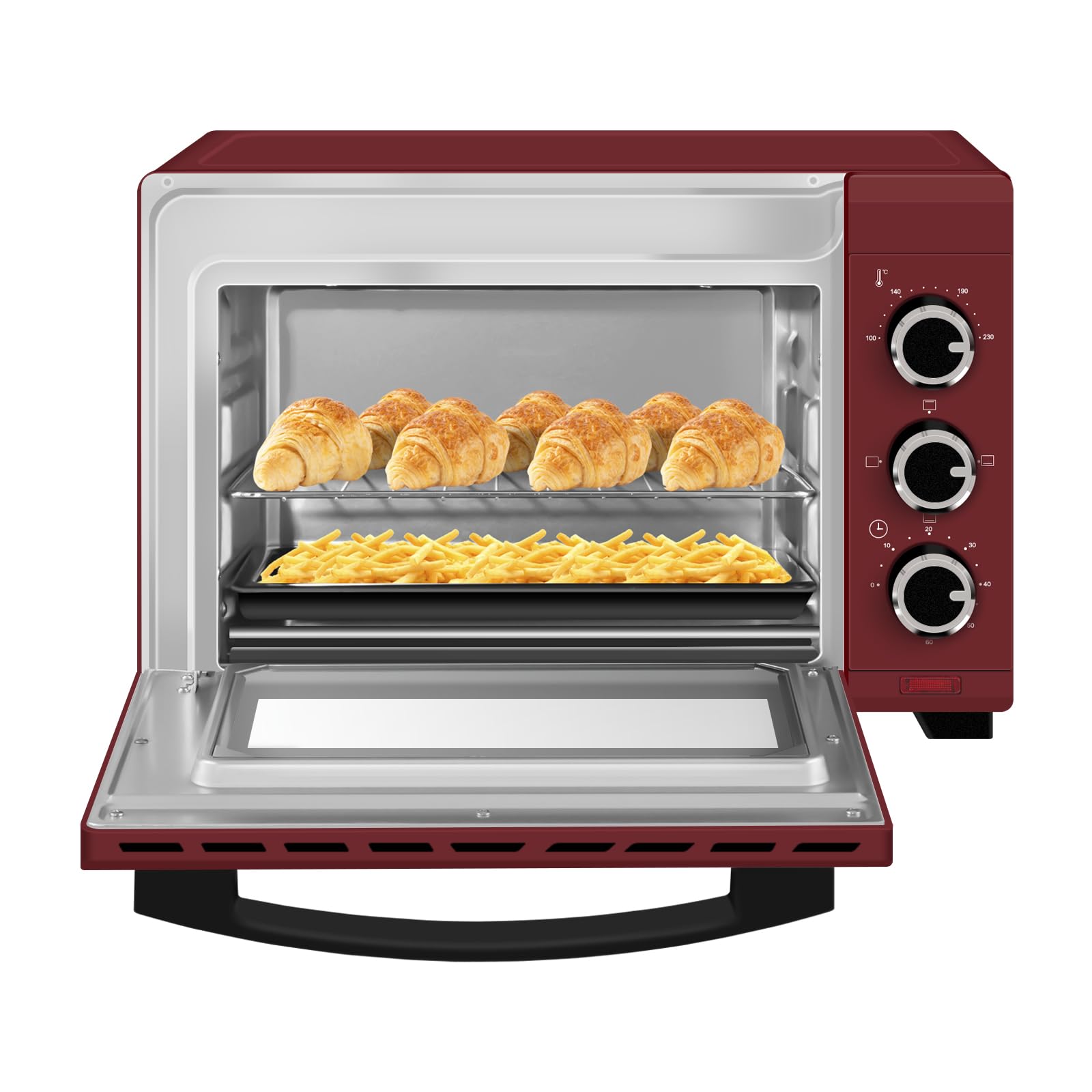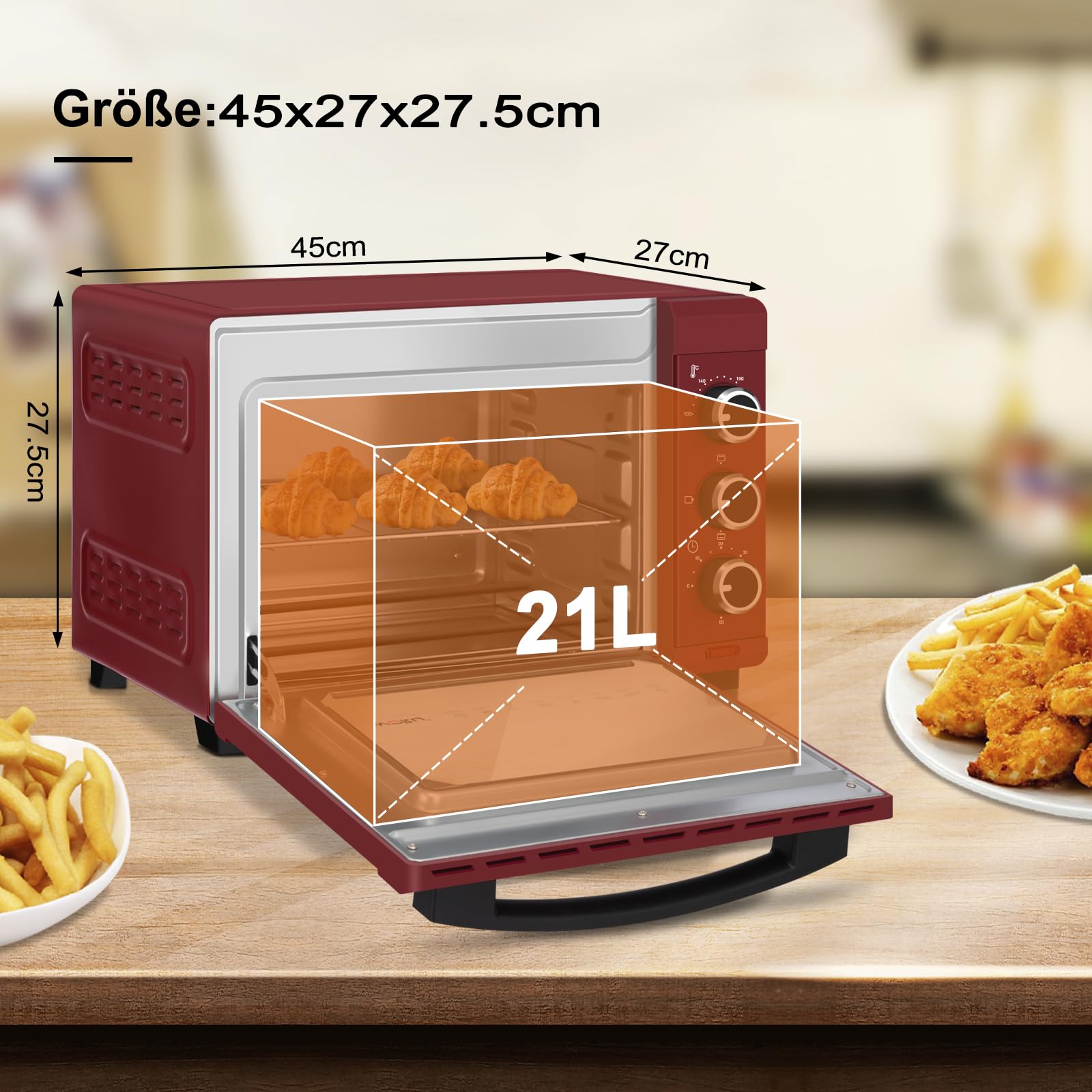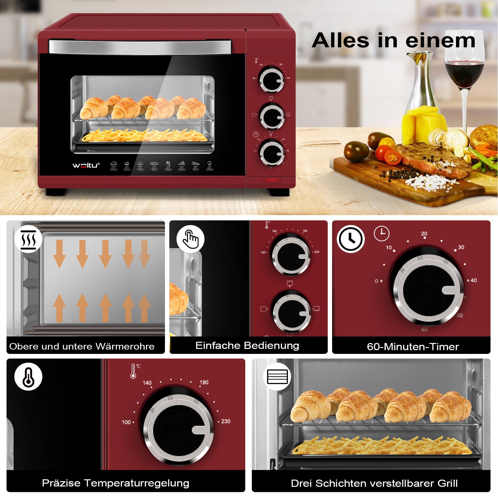 WOLTU Mini Backofen 21 L, elektrischer Minibackofen, Miniofen, Pizzaofen, 1280 W, 100-230 °C, Timer 60 Min., Ober-/Unterhitze, Doppelverglasung, Rot