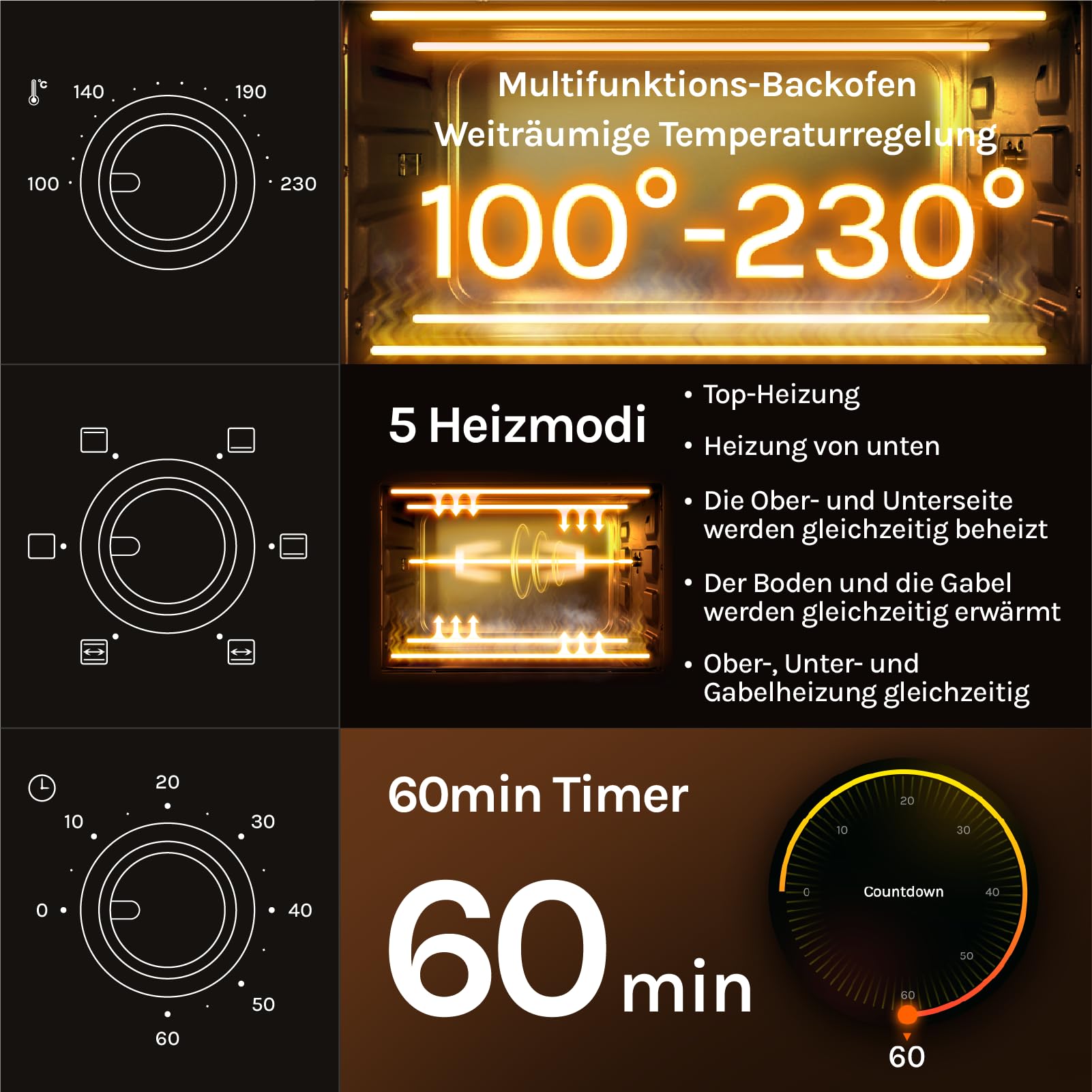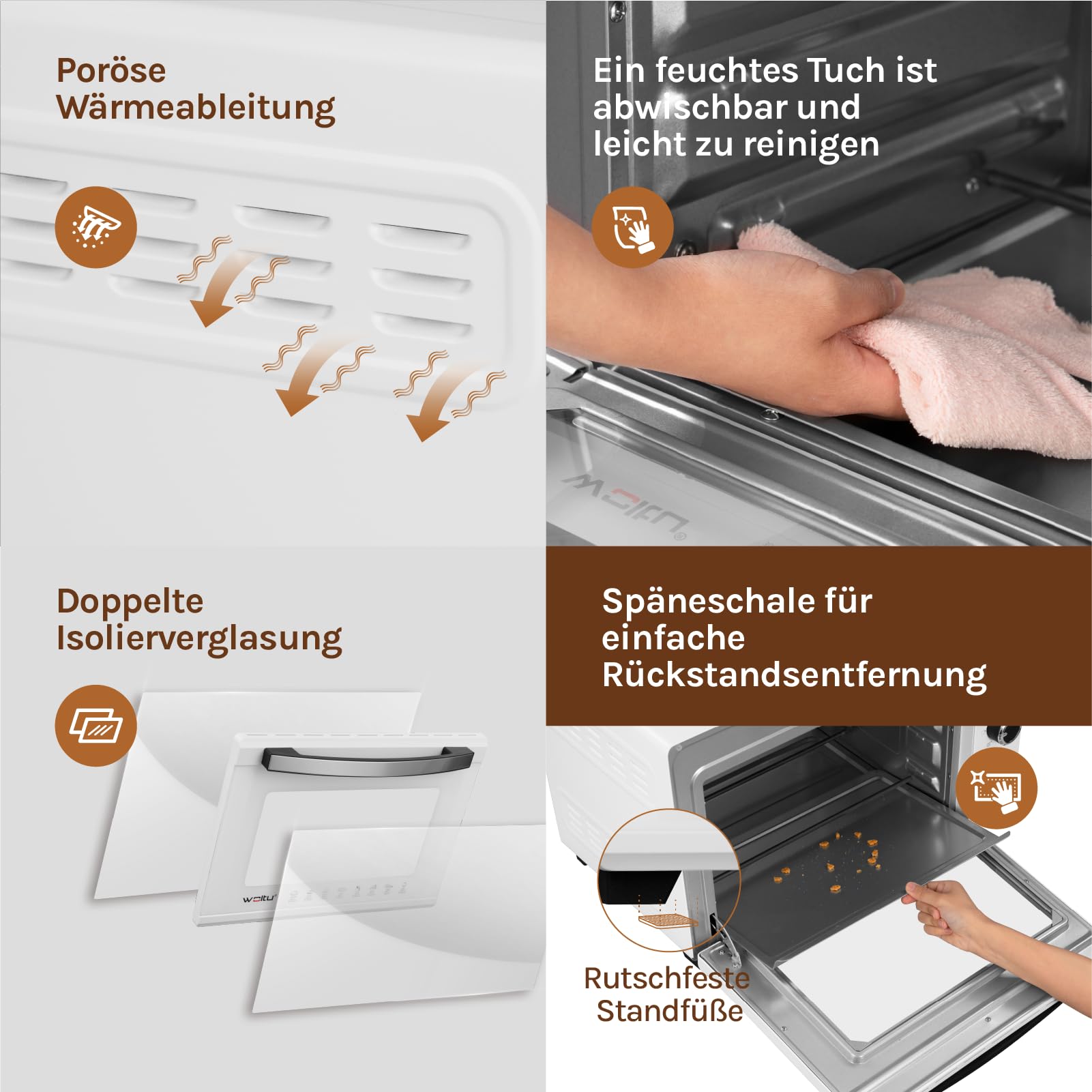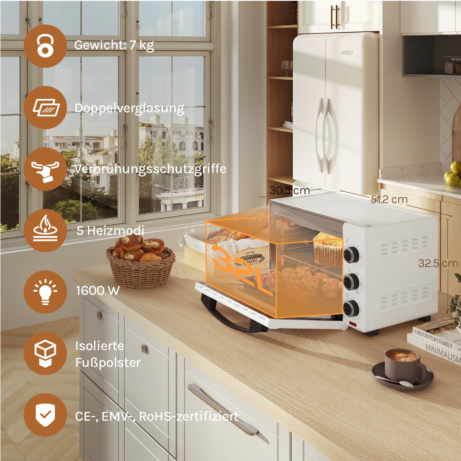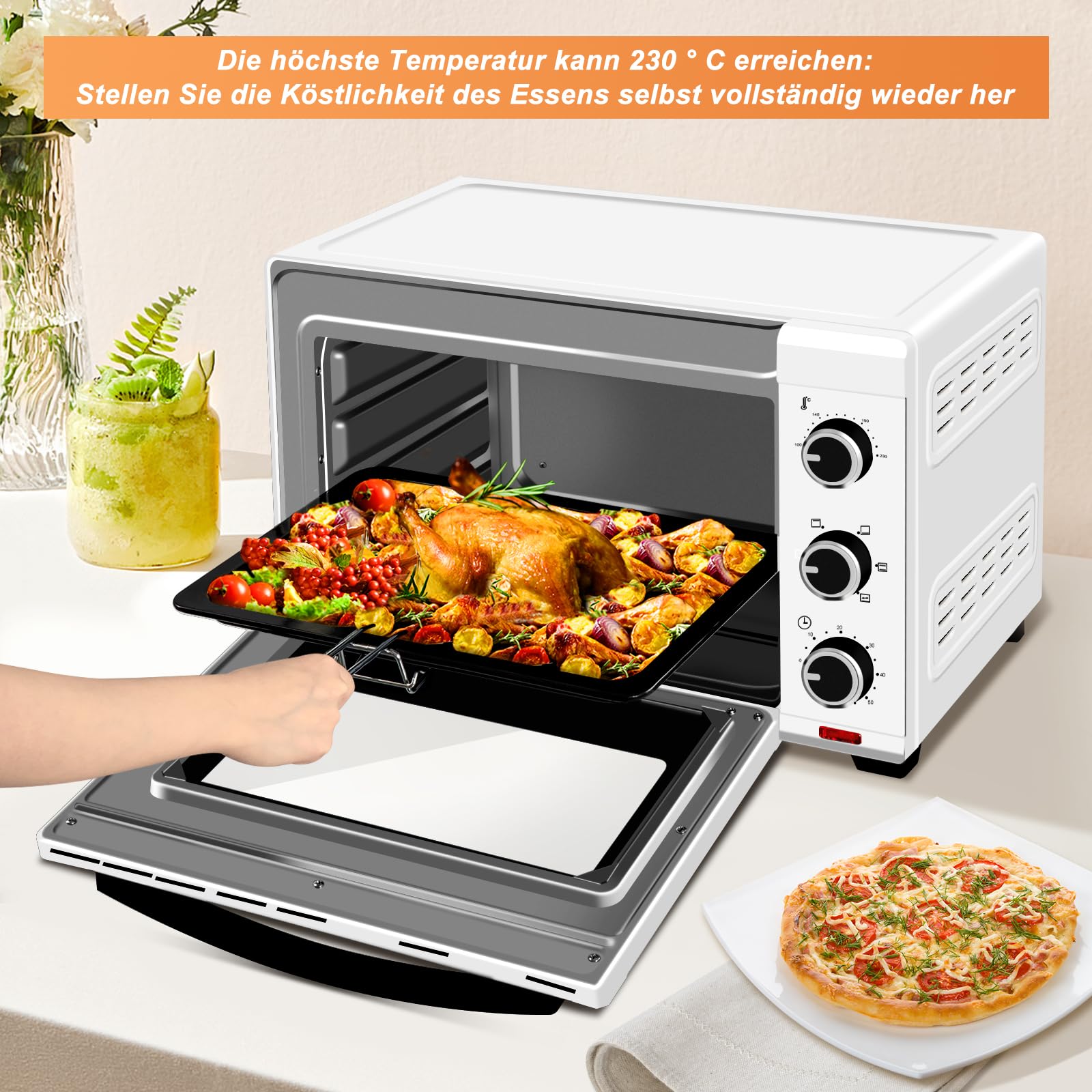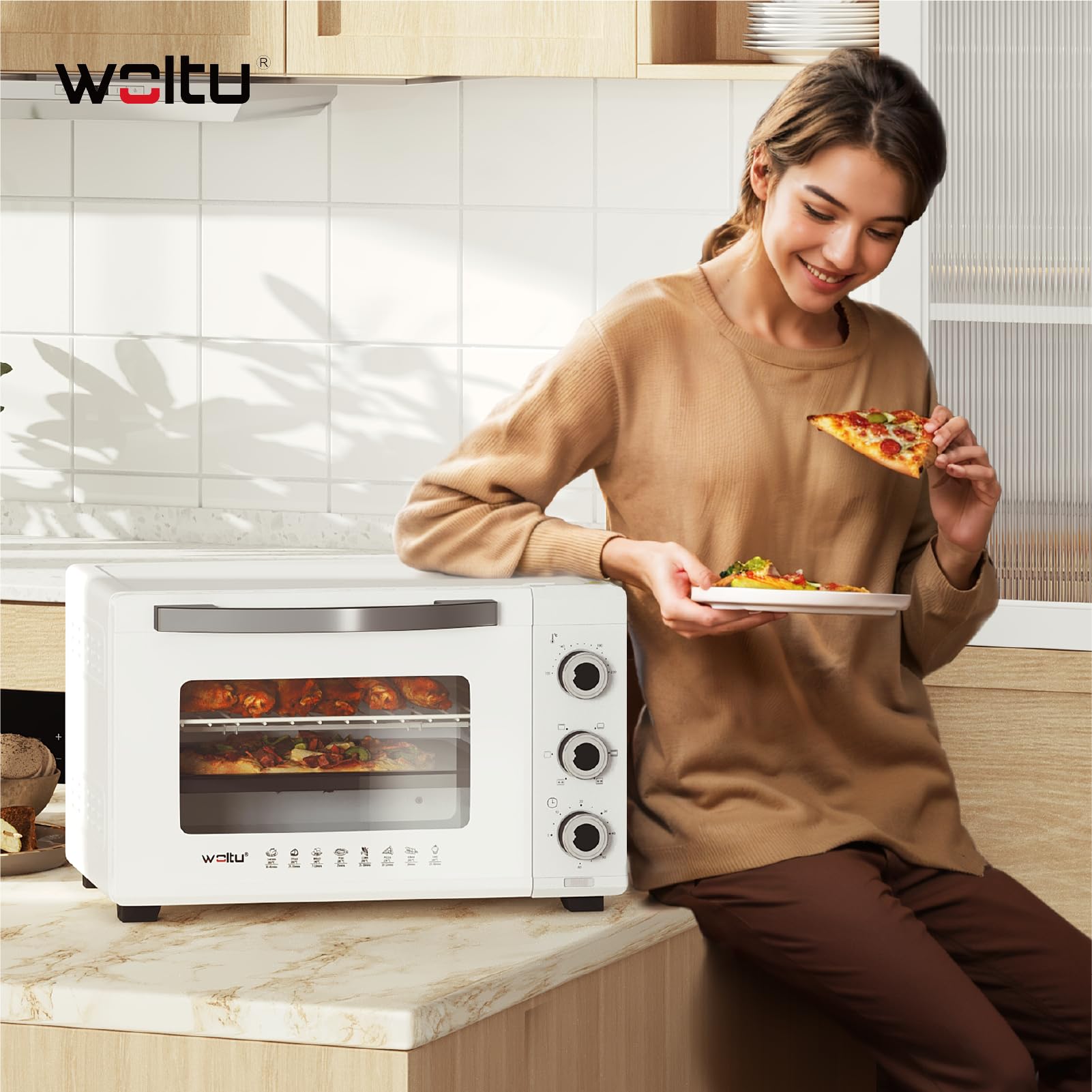 WOLTU Mini Backofen, Pizzaofen 32 L, 1600 W, 100-230 °C, 0-60 Min. Timer, 5 Heizmodi, Doppelglastür, mit Drehspieß Backblech Grillrost Krümelblech Rostheber, Weiß